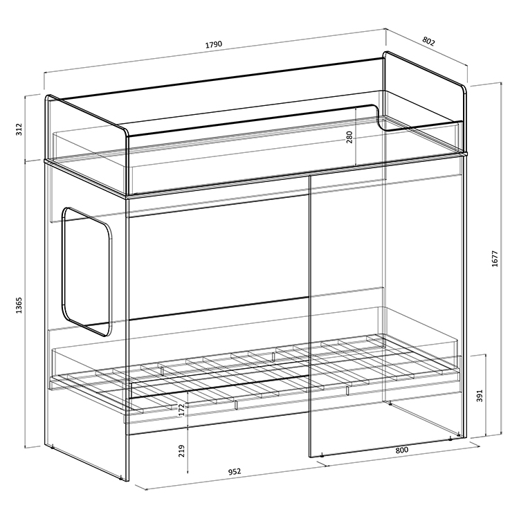 Классическая детская двухъярусная кровать с двумя параллельными спальными местами размером 1750х750 и 1900х750.